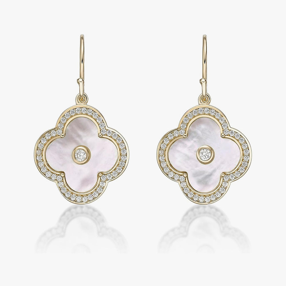 Handcrafted in fine 925 sterling silver, finished in rich 18K yellow gold, each earring showcases a shimmering mother-of-pearl clover with a twinkling lab-grown diamond, capturing the fourfold blessings of faith, hope, love, and luck.