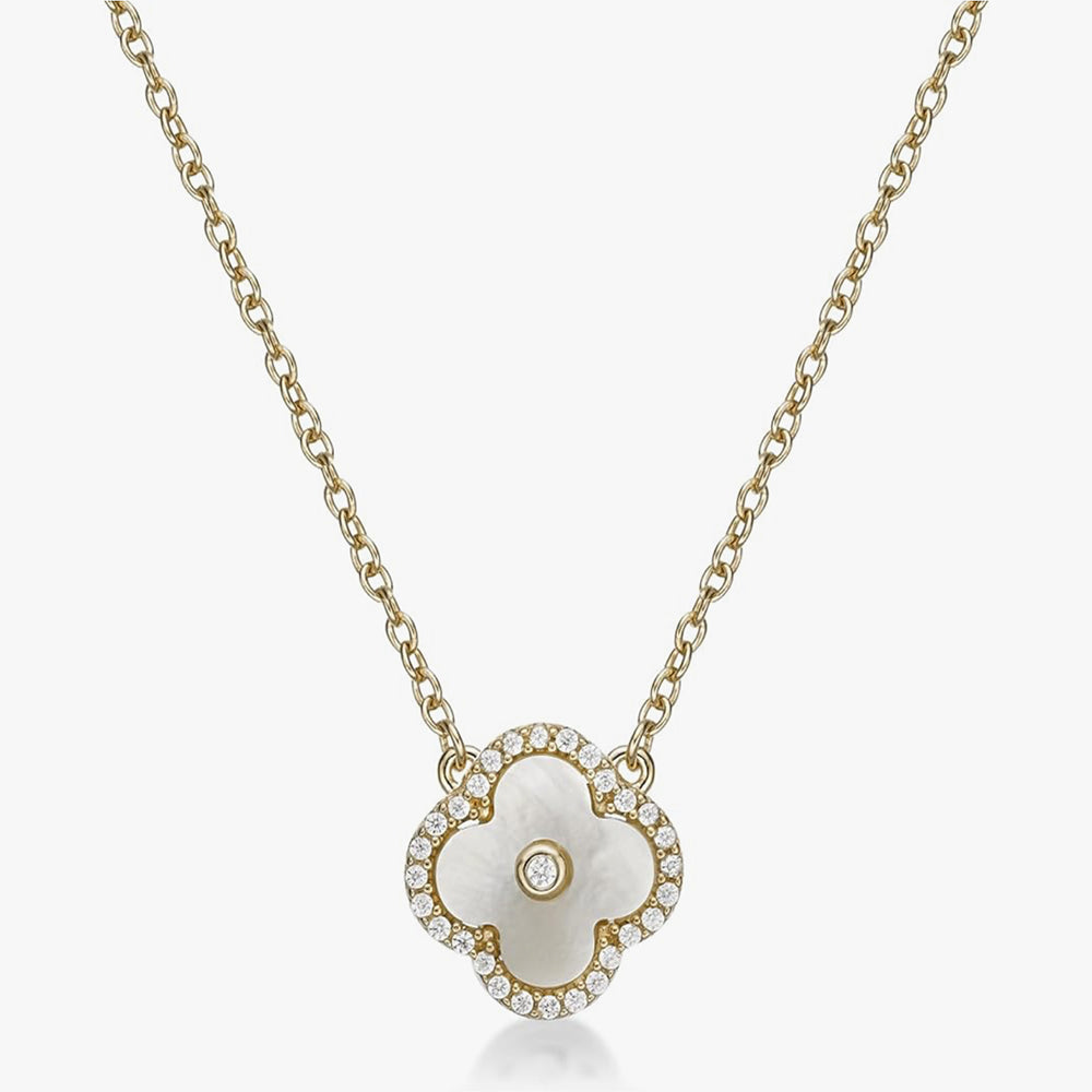 Crafted in fine 925 sterling silver, finished in rich 18K yellow gold, it showcases a radiant mother-of-pearl clover outlined with sparkling lab-grown diamonds (no four-leaf clover ever shone so bright!).
