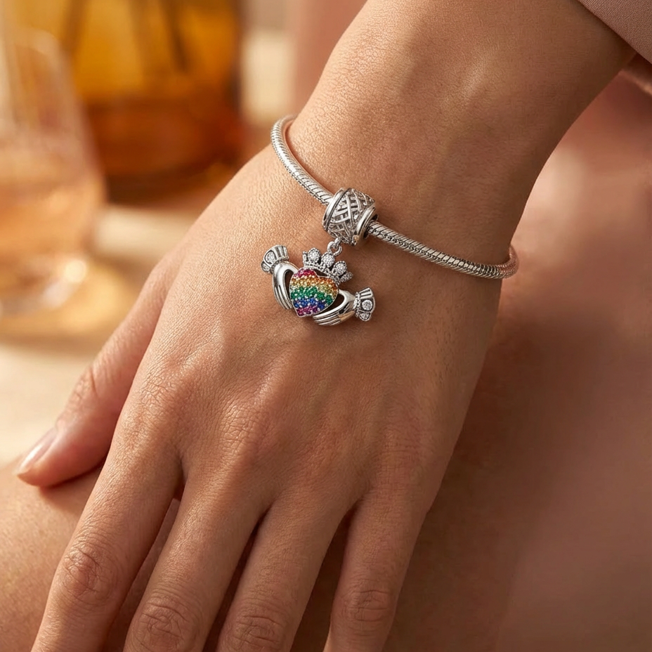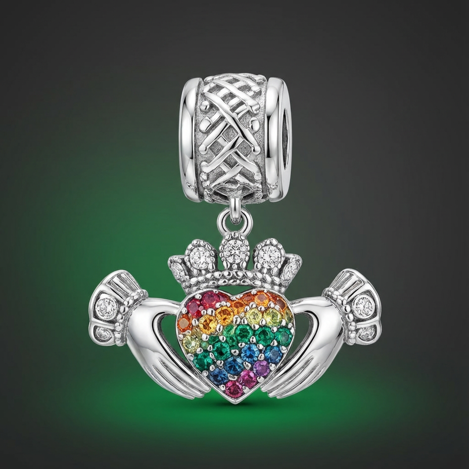 The Claddagh has spoken the language of love since the 1600s. Two hands for friendship. A heart for love. A crown for loyalty. Now, our Rainbow Claddagh™ Charm carries that same 400-year promise—illuminated with a spectrum of rainbow crystals that catch the light with every movement.